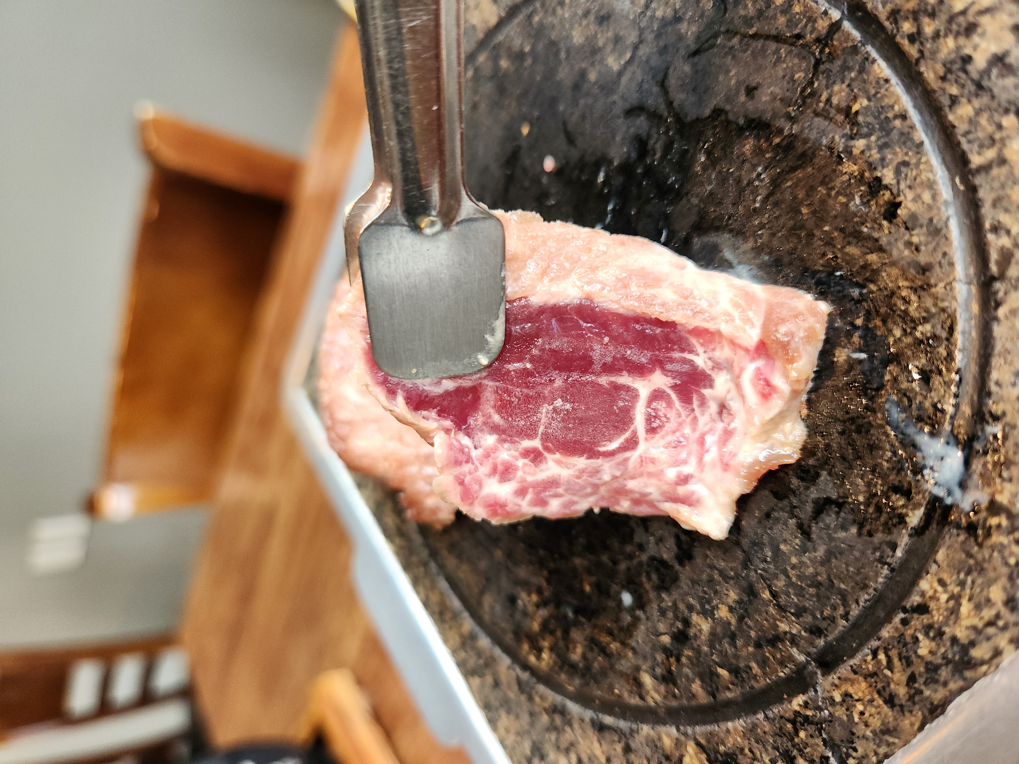 한 입 크기로 썰어진 고기를 개인 화로에서 구워 먹는 방식이에요.