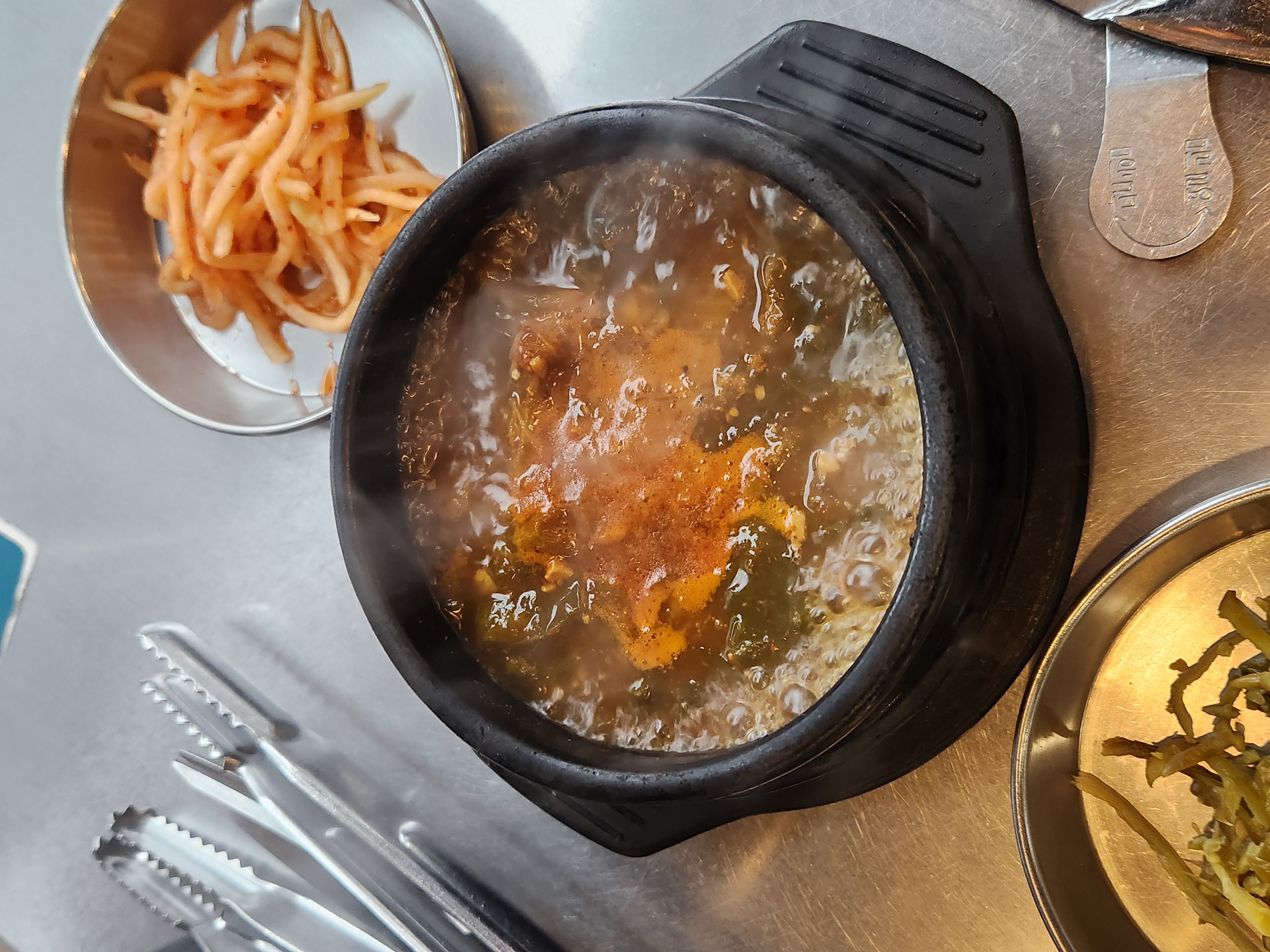 고기만큼이나 저를 놀라게 했던 또 하나의 포인트! 바로 기본으로 나오는 선지해장국이에요. 보통 고깃집에서 나오는 국물은 그냥 생색용인 경우가 많잖아요? 근데 여기는 완전 딴판입니다.